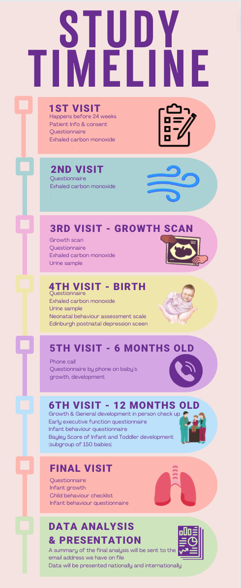 The impact of E-cigarettes during pregnancy on Childhood Health Outcomes (ECHO) study is an observational study being carried out across the three Dublin maternity hospitals, examining the health impact on babies born to women who use e-cigarettes during pregnancy. Throughout the study, we aim to collect a wide range of information on pregnant mothers and their babies. For this study, we are looking to recruit women who vape during pregnancy. For comparison, we are also seeking pregnant women who smoke and don’t smoke.