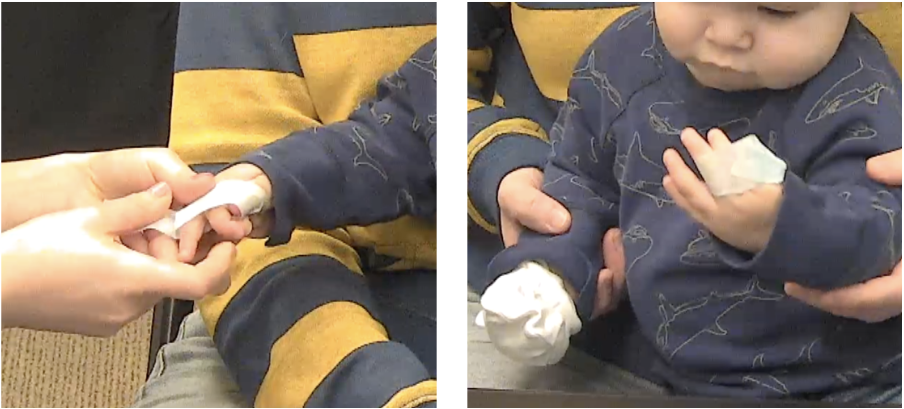 When observing some of these actions, your baby’s hand will be free and unrestricted. Before observing an additional set of actions, we will use some gentle tape, designed to be easily removed from skin, to hold your baby’s thumb alongside their index and middle fingers. We will cover their hands with mittens, to stop them from pulling off the tape. This is to stop the babies’ hands from moving while observing the actor’s actions. The tape used will be hypoallergenic and gentle on the infant’s skin. It is similar to a typical plaster.