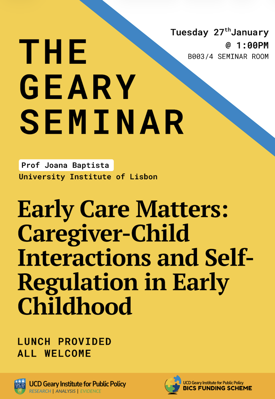 Visiting research collaborator Dr Joana Baptista from from University Institute of Lisbon will be giving a talk Tuesday 27th of January, 2026, at UCD Geary Institute entitled 'Early Care Matters: Caregiver-Child Interactions and Self-Regulation in Early Childhood'